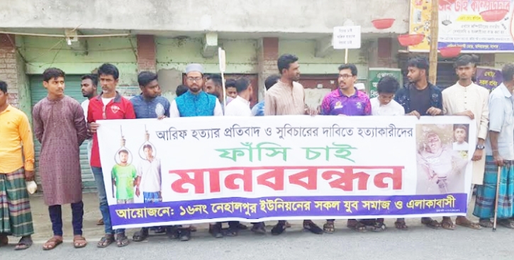 যশোরের মণিরামপুর উপজেলায় চাঞ্চল্যকর আরিফ হত্যাকাণ্ডের সঙ্গে জড়িতদের সর্বোচ্চ শাস্তি ফাঁসি এবং দ্রুত বিচার ট্রাইব্যুনালে মামলার বিচার দাবিতে মানববন্ধন করেছেন স্থানীয় এলাকাবাসী।শুক্রবার (৬ মার্চ) দুপুরে উপজেলার বালিধা বৈরাগী মোড় এলাকায় এই মানববন্ধন অনুষ্ঠিত হয়। এতে বিভিন্ন শ্রেণি-পেশার মানুষ, স্থানীয় জনপ্রতিনিধি, সামাজিক ও সাংস্কৃতিক সংগঠনের নেতাকর্মীসহ শতাধিক মানুষ অংশগ্রহণ করেন।মানববন্ধনে বক্তারা বলেন, আরিফ হত্যাকাণ্ডের পর থেকে এলাকায় শোক ও ক্ষোভের আবহ বিরাজ করছে। এমন নৃশংস হত্যার সুষ্ঠু তদন্ত ও দ্রুত বিচার নিশ্চিত না হলে অপরাধীরা আরও বেপরোয়া হয়ে উঠবে। তাই প্রশাসনের প্রতি দ্রুত তদন্ত সম্পন্ন করে জড়িতদের আইনের আওতায় এনে দৃষ্টান্তমূলক শাস্তি নিশ্চিত করার দাবি জানান তারা।বক্তারা আরও বলেন, সাধারণ মানুষ এখন আর বিলম্বিত বিচার চায় না। আরিফ হত্যার সঙ্গে জড়িতদের সর্বোচ্চ শাস্তি নিশ্চিত করতে হবে, যাতে ভবিষ্যতে এ ধরনের নৃশংস ঘটনার পুনরাবৃত্তি না ঘটে।এ সময় মানববন্ধনে অংশগ্রহণকারীরা হত্যাকারীদের দ্রুত গ্রেপ্তার ও ফাঁসির দাবিতে বিভিন্ন স্লোগান দেন। একই সঙ্গে তারা নিহত আরিফের পরিবারের প্রতি গভীর সমবেদনা জানান এবং বিচার না হওয়া পর্যন্ত আন্দোলন চালিয়ে যাওয়ার হুঁশিয়ারি দেন।স্থানীয়রা জানান, আরিফ হত্যাকাণ্ডের প্রকৃত রহস্য উদঘাটন করে জড়িতদের কঠোর শাস্তি নিশ্চিত করা হলে এলাকাবাসীর মধ্যে স্বস্তি ফিরে আসবে। এজন্য প্রশাসনের দ্রুত ও কার্যকর পদক্ষেপ কামনা করেছেন তারা।