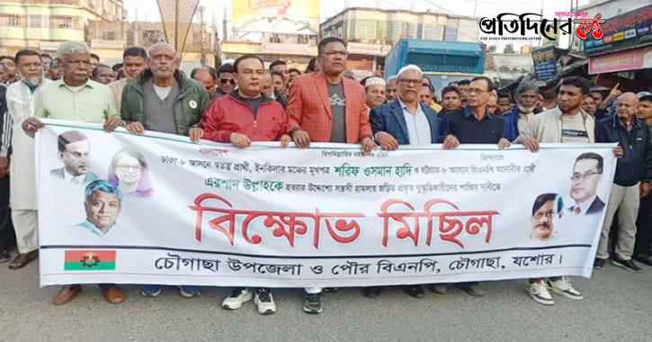 ঢাকা-৮ আসনের স্বতন্ত্র প্রার্থী ও ইনকিলাব মঞ্চের মুখপাত্র শরিফ ওসমান হাদি এবং চট্টগ্রাম-৮ আসনের বিএনপির মনোনীত প্রার্থী এরশাদ উল্লাহর ওপর হত্যার উদ্দেশ্যে সন্ত্রাসী হামলার প্রতিবাদ এবং ঘটনার সঙ্গে জড়িত প্রকৃত দুষ্কৃতকারীদের দৃষ্টান্তমূলক শাস্তির দাবিতে যশোরের চৌগাছায় বিএনপির উদ্যোগে বিক্ষোভ মিছিল ও প্রতিবাদ সমাবেশ অনুষ্ঠিত হয়েছে।